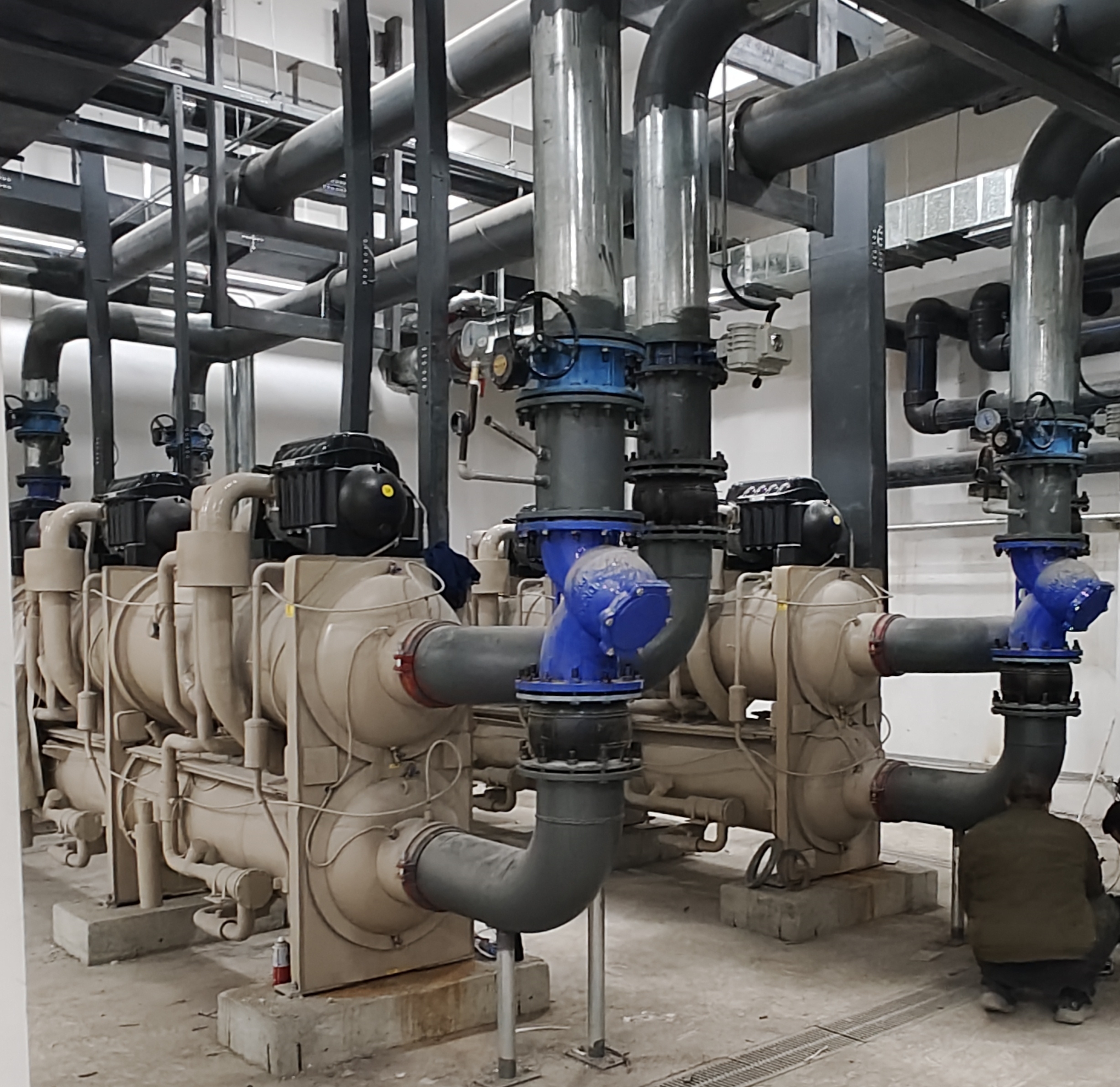 中,暖通机房及地源井施工由我单位负责承建,目前工程已进入竣工收尾。本项目的主机选用2台450RT磁悬浮地源热泵机组进行制冷制热。